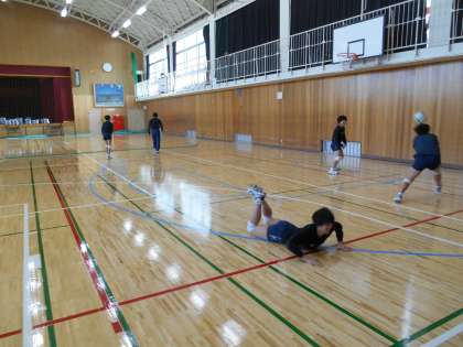 女子バレーの気合のこもった練習風景です。転げまわってボールを取りにいきます。