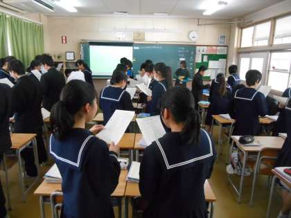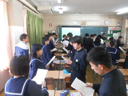 最後の英語の授業です。始めに右側の人が質問だけして、左側の人が答えます。シンプルですが、こうすると、全員が会話練習を短時間で何度もできます。