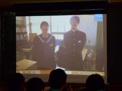 1年生から、3年生に贈るビデオを見ています。担任の先生のものまねも登場して盛り上がりました。
