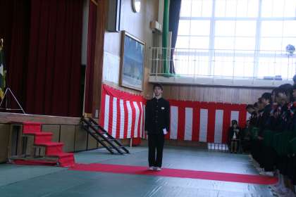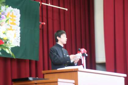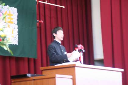 在校生代表による送辞です。式後、多くの保護者から「あの送辞を読んだ生徒、いい声してますね。内容もすばらしい。」とほめていただきました。私もそう思います。「朝のあいさつ運動で聞く声ですよね?」と聞かれたので、「そうです。そうです。毎朝、住南小の校舎に響いています。」と答えました。立派な送辞でした。