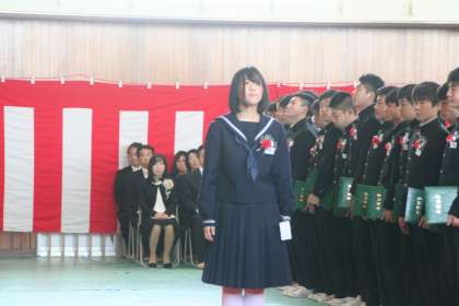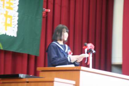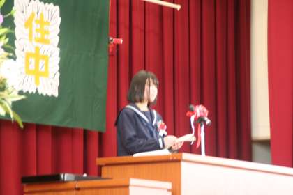 卒業生代表による答辞です。こちらも、保護者の皆様に絶賛されました。ある保護者の方は「今、一粒でも涙を流したら、止まらなくなるので、必死でこらえました。」「私は、我慢できず、泣きました。すばらしい答辞でした。」「すごいですね、あんなことが言えるのですね。すごい。」「出だしから、他の答辞とはちがっていましたね。『経験とは…』この出だしから、すごいと感じました。」「『私たちは先生方が胸を張って送り出せる生徒になっているでしょうか。』というくだりは、鳥肌が立ました。」など、多くの人から、ほめていただきました。本当にすばらしい答辞だったと思います。すばらしい。