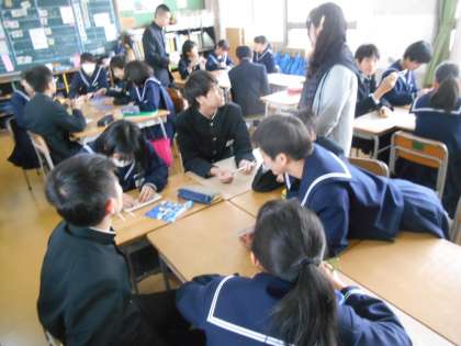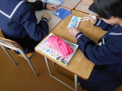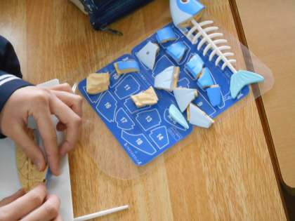 魚の食べ方と箸の持ち方を学習しています。初めて見たときは魚の模型に驚きました。