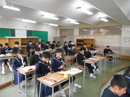 授業が少しずつ始まります。これは音楽の授業で笛の練習をしているところです。
