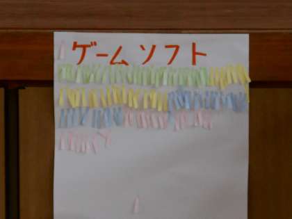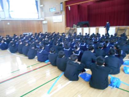 4限の体育館です。Line(ライン)で嫌なことを言われる、「宿題を見せろ」と言われる、ゲームソフトを勝手に使われる、長距離走を無理に押し付けられる、シャーペンを勝手に使われるなどの行為を先生たちがロールプレイでやってみせ、生徒のみんながどれが嫌なのか、付箋(ふせん)で投票しました。