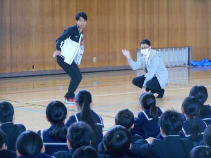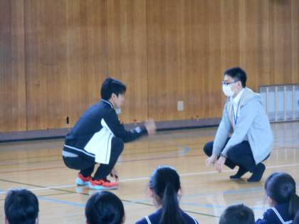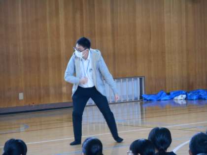 先生たちが「進化じゃんけん」の説明をしていました。卵、カエル、鳥、人間とじゃんけんが勝つと進化していきます。