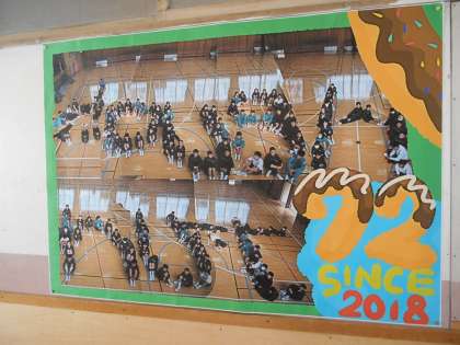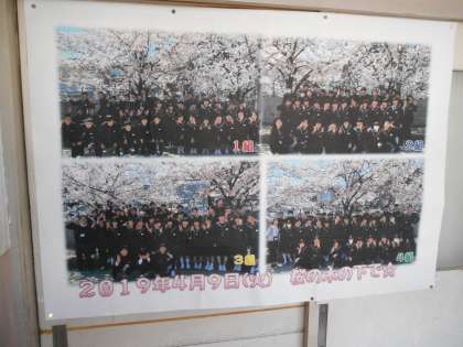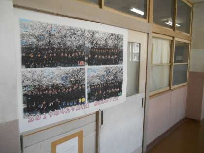 2年の廊下には、先日の桜の木の下の学級写真と体育館での人文字の写真が掲示されていました。