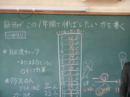 「1年間、自分が伸ばしたいこと」ということで、先生から質問をしていました。1枚目は「近所の人とあいさつをする人は?」と聞かれて、36人中、32人が手を挙げているとことです。すばらしい。ちなみに全員の36人が手を挙げたのは、「前日に学校の準備を家でしっかり行う。」という質問でした。先生が、すごくほめていました。とても大事なことです。