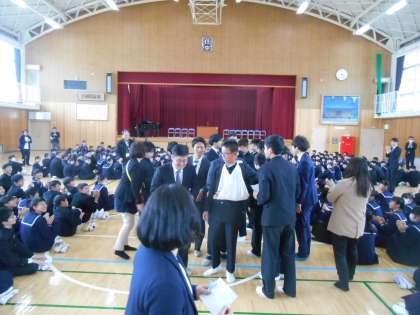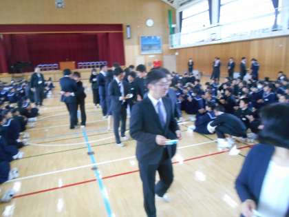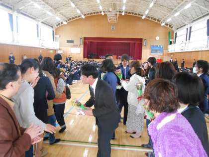 離任式が終わり、生徒と保護者(PTA役員と実行委員の方が花束を持ってきてくださいました)の花道を通っているところです。ここでまた、涙です。