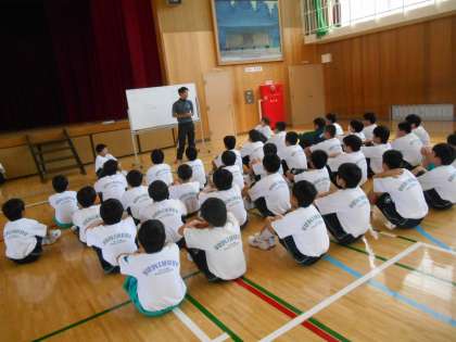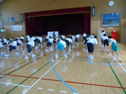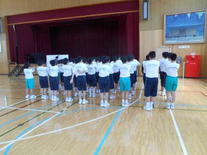 「元の位置に」の指示で腕を上げ、足を曲げ、集合位置に全力で向かう姿勢(1枚目)を取り、移動し、5秒で整列し(2枚目)、着席して先生の話を聞く(3枚目)という流れでした。すばらしい。