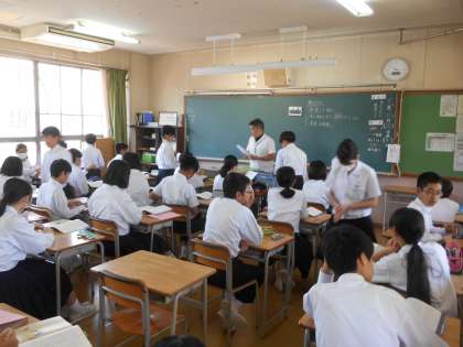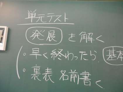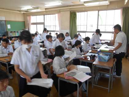 この授業でも単元テストを実施しました。写真はテストを終え、集めているところです。