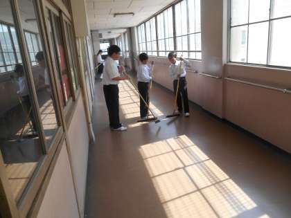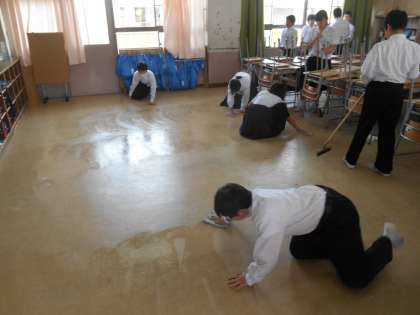 そうじ風景です。今日はたまたま1年生ですが、どの学年もまじめにそうじしています。すばらしい。