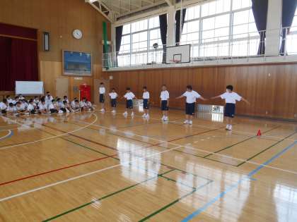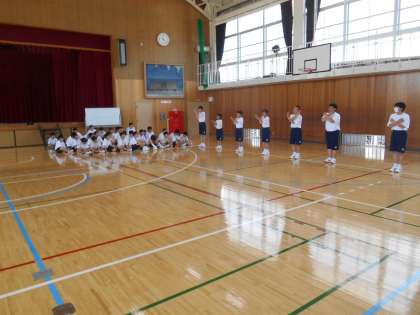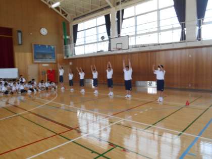 グループ毎に体操をしています。号令は自分たちでかけていました。