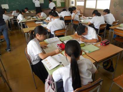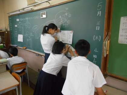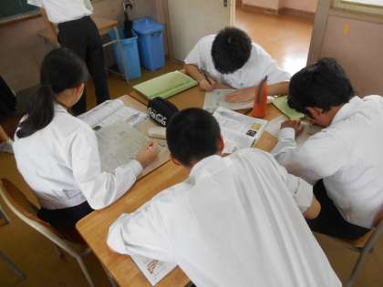 問題を解き、答え合わせをする生徒、学び合いをする生徒たちです。