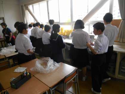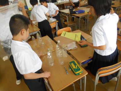 全ての色は三色が基本で、その割合で決まるとされています。その三色をペットボトルにうまく配合して多くの色を作ろうという授業です。これは全部を見るととても面白い授業です。