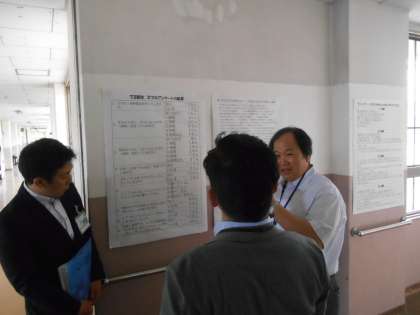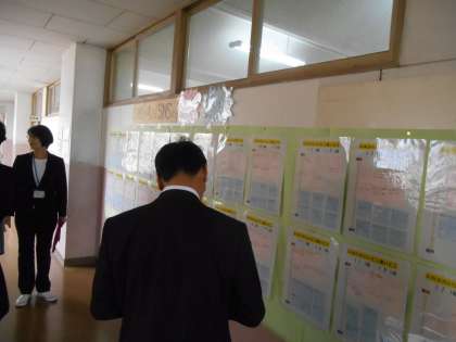 本校の掲示物に関心をもっていただきました。ここは1年生のSNSについて、自分たちの考えたものを掲示しているところです。中学生が一日にどれだけスマホを触っているのかなどのアンケート結果が紹介されています。