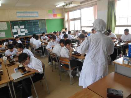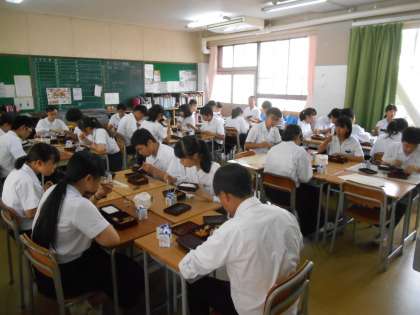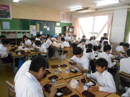 ちょうど13時ごろの教室です。おいしそうに食べていました。3枚目は給食担当の先生がのりやごはんのおかわりがないか、聞いているところです。この直後、のりをもらう人の手が挙がりました。