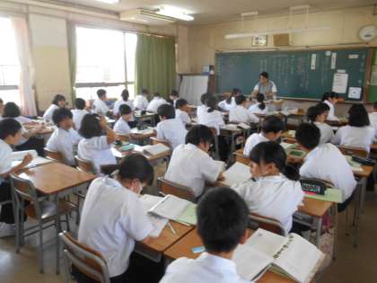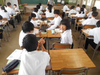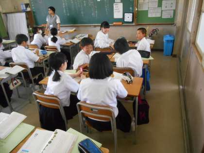 教科書の内容について、隣(後ろ)の人と意見交換をしているところです。これをすることで他者の考えを知り、思考の幅も広がるし、自信のない生徒でも発言しやすくなります。