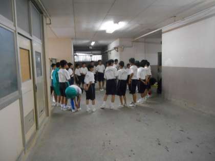 今朝は雨でした。サッカー部とラグビー部がピロティで軽い運動を始めようとするところです。