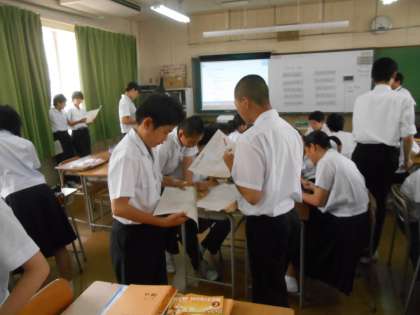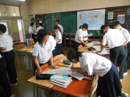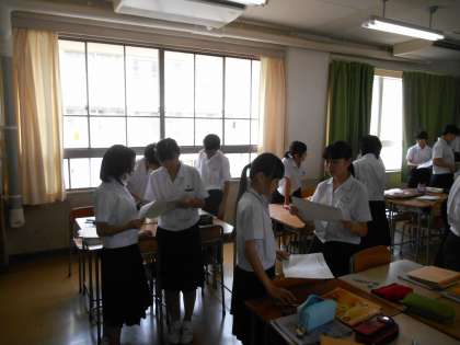 先生が説明しているときはシーンとして聞き、「では、3人以上の人と今習った英語を使って会話をしてサインをもらってください。」と指示があると、ドドドっと動き、一斉に英会話が始まりました。すごいです。すばらしいです。こんな授業をしていると、自然と誰とでも話せるクラスになると思います。