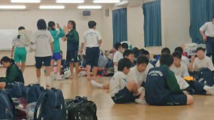 マリン体験を終了し、シャワーを浴びたクラスから多目的室で待機です。