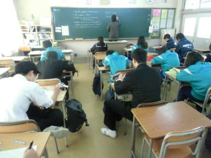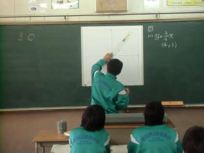 2枚目は1年生の数学の時間です。中村先生が「みんな、聞いて。さっきものすごくいい説明を先生にしてくれた人がいるんです。その人に今から説明してもらいます。」と言われて、前に出てきて関数のグラフ「Y=4分の3X」について、みんながわかる説明をしてくれました。立派でした。人に説明することで理解と記憶が倍になります。授業後、中村先生が「今日の授業に参加していた人は必ず、分数のグラフについて理解が増したはずです。」とのこと。