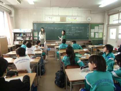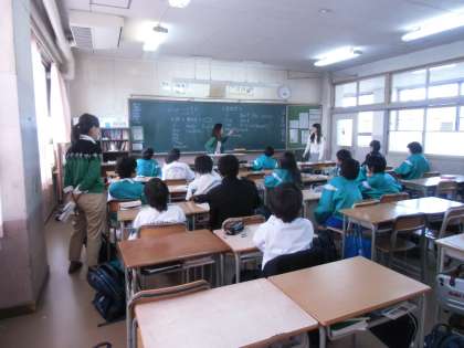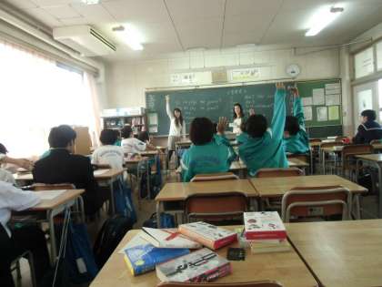1年の英語の時間です。3人の女性の講師の先生。一人は説明役、一人は板書と説明、もう一人は生徒の机を回り、質問を受けます。息がばっちり。3枚目は手がたくさん挙がっています。