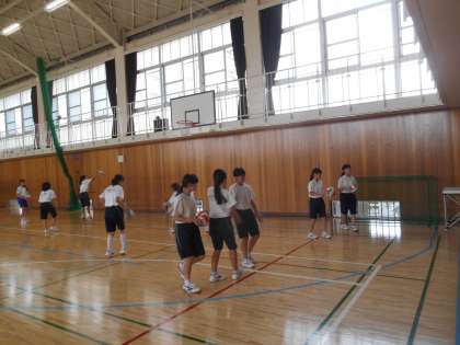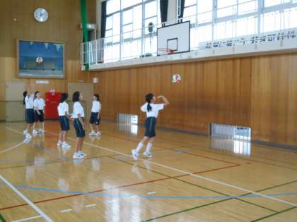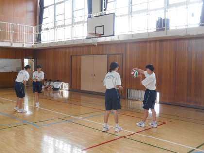 バレーのアタックの腕の振りを練習していました。バレー部の生徒も教えていました。