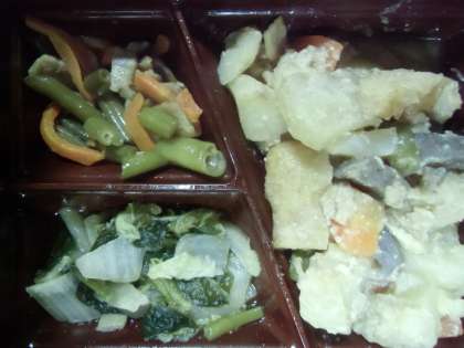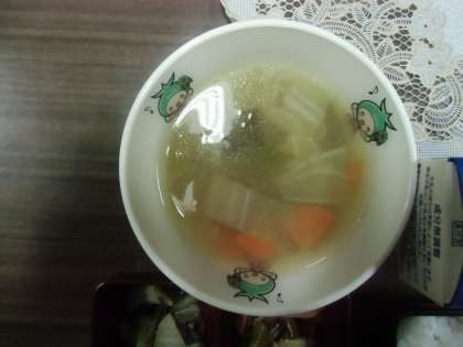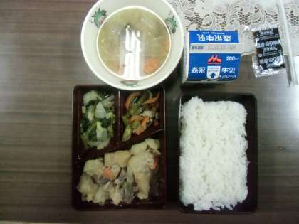 今日の給食です。みそおでん、ほうれんそうのおひたし、三度豆の炒め物、よしの汁でした。船場汁、よしの汁といろいろあるんですね。