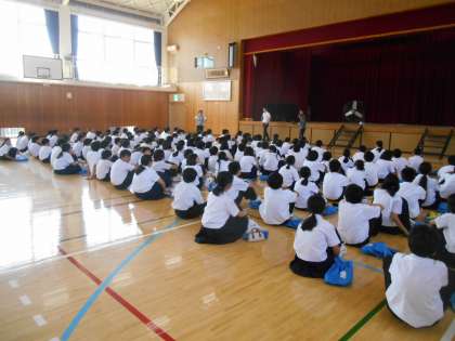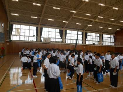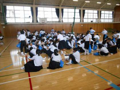 5限、体育館で諸注意のあと、何度も何度も隊形の並べかえの練習をしていました。大事なことです。大人数で動くので、こういうことがすばやくできないと行程が遅れたり、人数点呼で不備が起こったりします。とても大事です。
