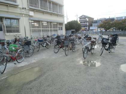 とてもうれしいことがありました。1・2年進路説明会のときに、多くの方が自転車で来られていたのです。その自転車が突風で30台くらいドミノ倒しに。そんなことも知らずに玄関ロビーで、保護者の方を多目的室にご案内していたら、3年生男女二人が「えらいことです。教頭先生、自転車がはしから全部に近いくらい倒れています。」と言いに来てくれました。それどころか、その二人も一緒に自転車のところに来て、自転車を立ててくれました。うれしいじゃありませんか。さっそく職員室に行って報告しました。写真1枚目は倒れているところ、2枚目が立てたところです。