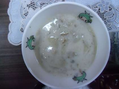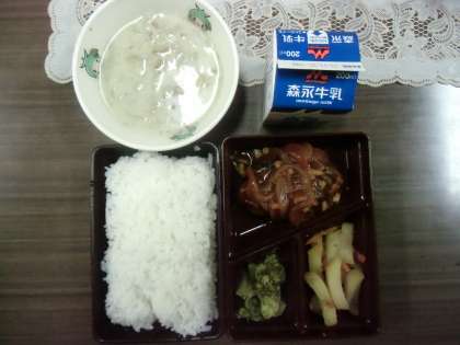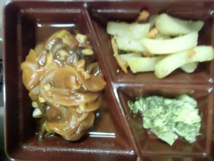 今日の給食は煮込みハンバーグ、じゃがきんぴら、ブロッコリーのごまあえ、きのこのポタージュでした。前回よりハンバーグがずいぶん柔らかくなりました。