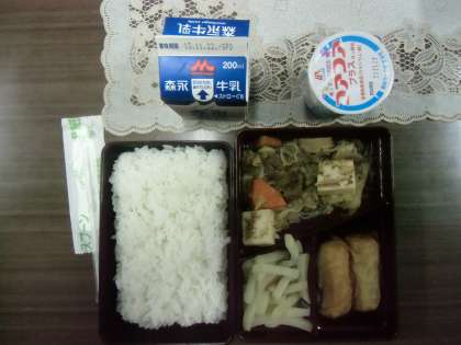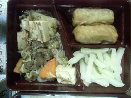 朝のスケッチは都合により休みました。すみません。さて、今日は、すきやき煮、ごぼう天のふくめ煮、じゃがいもの炒めあえ、ヨーグルトです。