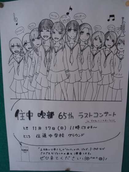 11月17日(日)はいよいよふれあいフェスタです。住道中の吹奏楽部が出演してくれます。自分たちでポスターを書いてくれ、全教室や廊下に掲示してくれました。一人でも多くの来場を待っています。このイベントを通じて、地域や保護者の方、学校関係者が少しでも顔見知りを増やし、子どもたちによってよりよい教育環境をつくっていこうというものです。よろしくお願いします。