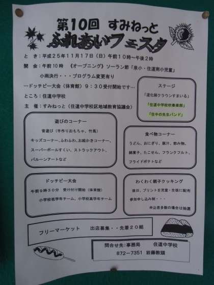 住道中PTAもうどんや豚汁の店を出します。中学生が各模擬店のお手伝いもします。プロの大道芸人の方が「道化師クラウンすまいる」と称して、ステージをしてくれます。住道南小、泉小、住道北小のこどもたちが南中ソーランを踊ってくれます。とにかく、一人でも多くの人に遊びに来てほしいです。