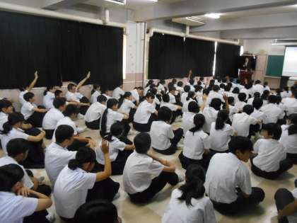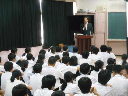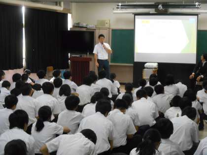 2年生の職場体験(9月上旬)を前に、二人の方を講師に実際の仕事についてお話を聞きました。大変感銘を受ける話がたくさん聞かれました。「〇〇(人の名前)から商品を買ってやろう。」と言われるほどの信頼を得られた時がとてもうれしい。」「友だち同士なら約束を忘れてもごめんで済むかもしれないが、仕事だと、そうはいかない。多くの人に迷惑がかかる。」「実際には働き出して、本気で勉強するようになった。学校時代は大人になったときに本気で勉強できる力を身に着ける時だ。」などと深い意味の言葉をいくつも聞かせていただきました。ありがとうございました。2枚目の写真は「将来の夢がある人は手を挙げて。」と講師の方がおっしゃったときの写真です。