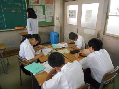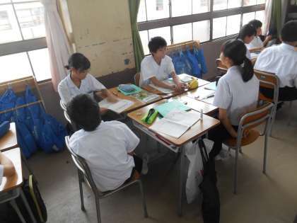 一汁三菜でバランスの良い食事を考えようという授業です。写真はまず、教科書を見て、自分で考えているところです。