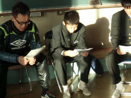 おはようございます。朝出勤して校内を巡回すると、なななんと、4階生徒会室から大きな声が聞こえるではありませんか。「お・も・て・な・し…」とかなんとか。これは、と思ってのぞいてみると、生徒会役員と生徒会担当の中田先生が何やら台本のようなものを持ちながら、練習していました。そうです、11月25日(月)の生徒総会に向けて、劇の練習をしていたのです。何事にもがんばる姿は本当に感動ものです。
