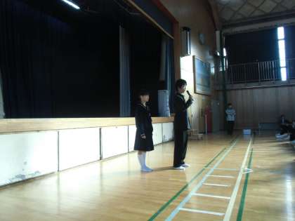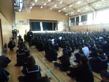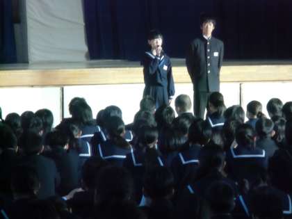 生徒集会の様子です。生徒集会は原則生徒からの話で進みます。生徒会役員が指示をし、整列し、始めていきます。今日は一番に生徒総会のことで訴えがありました。