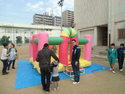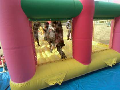 ソーランのあと、体育館ではドッチビーが始まっています。グランドは模擬店がオープンし、お客さんが買い始めています。中央幼稚園のふわふわはやっぱり、子どもたちには大人気でした。