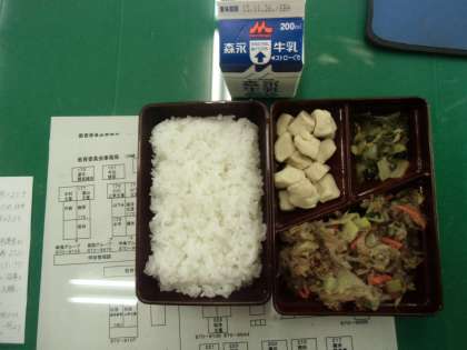 今日の給食は、春雨のひき肉炒め、高野豆腐の含め煮です。今日は風が冷たく、校舎の外に出ると、「さぶ〜。」と全員が言いながら運搬していました。