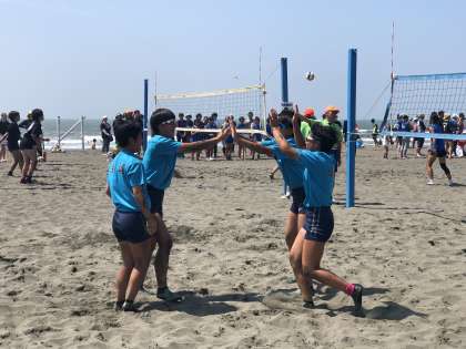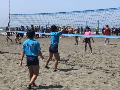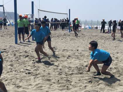 2日目はトーナメント戦です。茨城県、京都府、福岡県と当たっていきました。どのチームもバレーが上手で、ボールさばきがうまいです。身長が175センチ以上あるのでは?と思うような長身選手がいるチームもありました。「さすが全国、、、」と感じることが多かったのですが、この日はコートの中も外も声をかけあい思わず「上手い!!」と声が出てしまうほど風にも慣れていく姿を見せてくれました。勝ち上がって最後の決勝戦は地元神奈川県のチームです。空いている所を狙い定めて返してくるところはさすがでした。