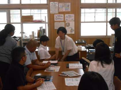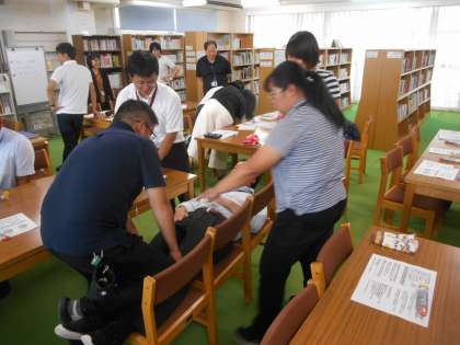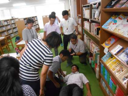 続いてアレルギー研修会をもちました。4月に実施したのですが、細かいところを復習しておかないといざというときに対応できないということで、8月にも勉強しました。やるたびに改善策が出されて、記憶も鮮明になるので意義がありました。写真は、実際にエピペンを打っている(模擬)ところです。