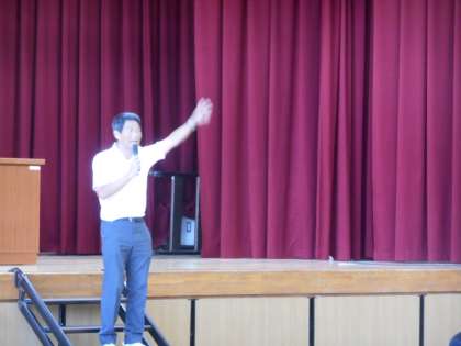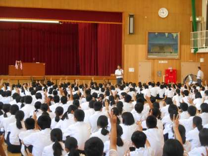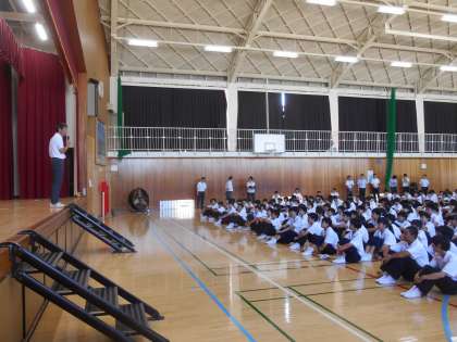 1.命に関わるような事故がなくてよかったです。2.夏休みのうれしかったこと、生徒のがんばり、ありがとうの話。3.2学期がんばろうの話を校長からしました。3枚目の写真は、何事も取り組み過程の努力をどれだけするかで、感動の量が変わってくるという話しをいつものオーバーアクションでやっているところです。
