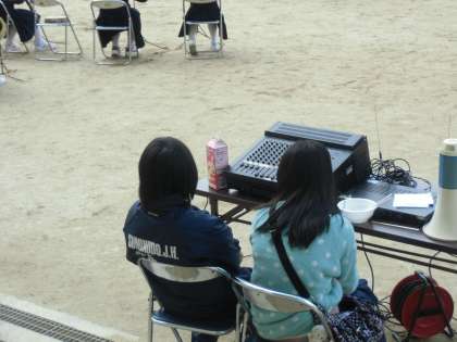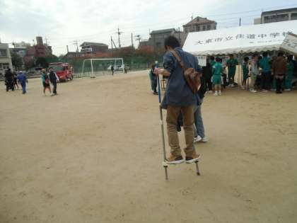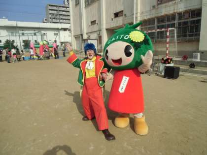 なかなかフェスタの写真をアップできませんでした。すみません。1枚目はステージや会場全体の放送を取り仕切ってくれた放送部の人たちです。この人たちが来なかったら大変でした。ありがとうございます。2枚目は昔遊びの竹馬で遊ぶ青年です。これ、けっこう難しいんですよ。3枚目はいよいよ大道芸人クラウンさんの登場。ダイトンくんと記念写真です。