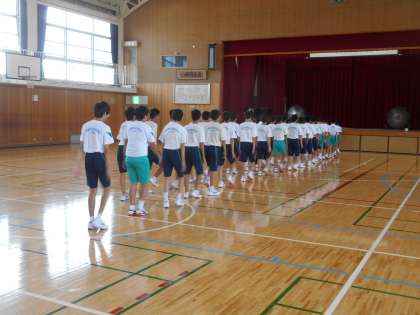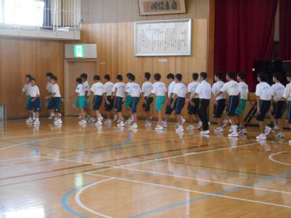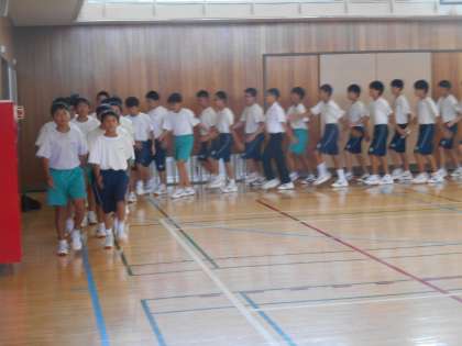 集団演技の練習です。始めにその場で、足踏みの練習をたっぷり行いました。