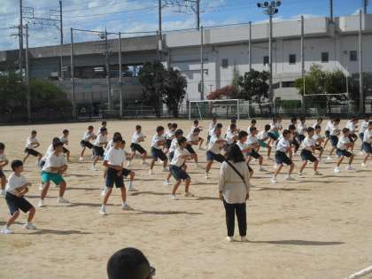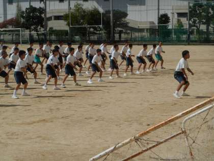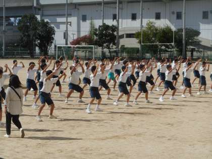 集団演技の練習を気温が高い中、一生懸命やっています。声が聞こえないのが残念です。