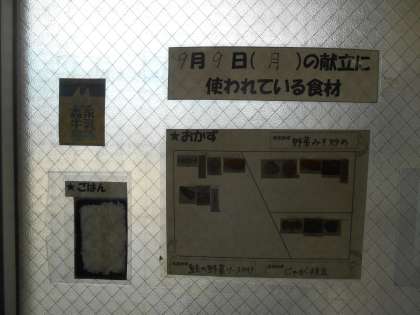 これは本日の食材等を紹介したものと4限後に配膳室に給食を取りに来た生徒が手を消毒しているところです。