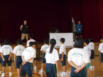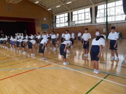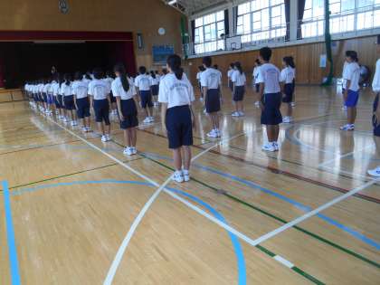今日は男女合同で体育をしました。体育大会前で、礼やラジオ体操、行進などを練習しました。暑い中ですが、集中して練習していました。