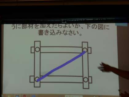 「五重塔がなぜ、何百年も倒れないか。」を考える授業です。魅力あります。それをシンプルな図形に置き換えて、考えていました。図面上三角形があるほど強度が増すそうです。