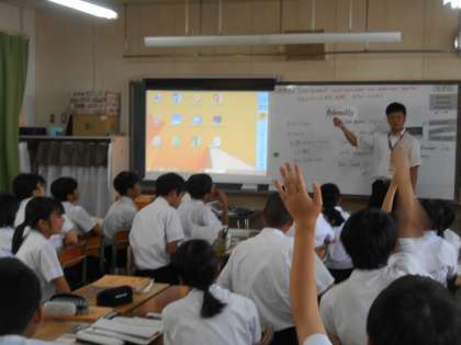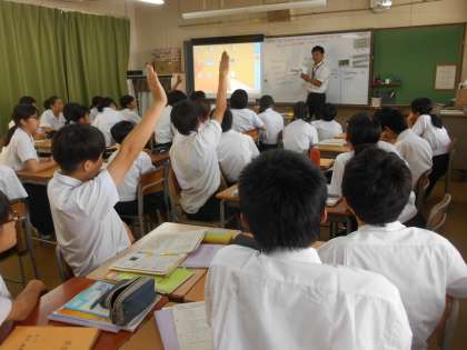 英語の先生が単語のカードをみんなに見せて発音を確認しているところです。「この読み方は?」と先生が質問すると、積極的に手が挙がっていました。気持ちがいいです。